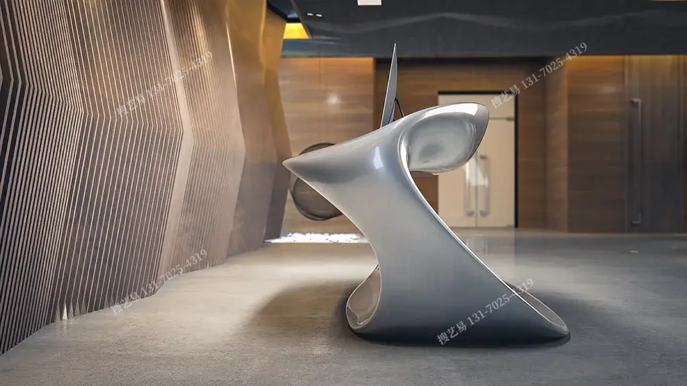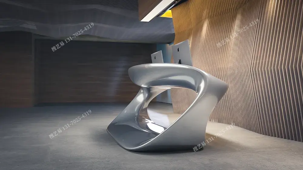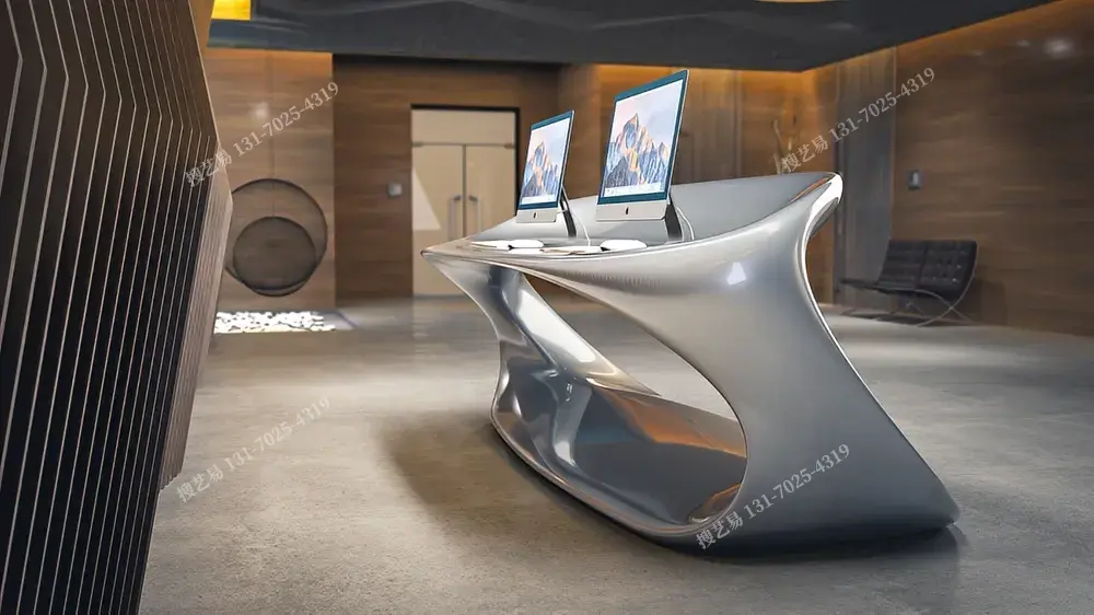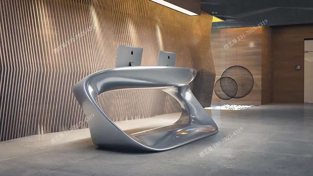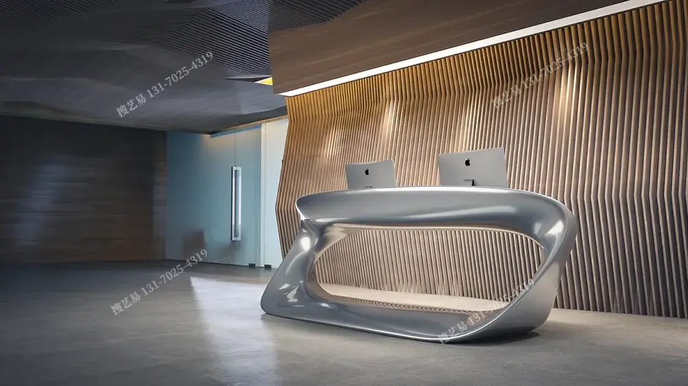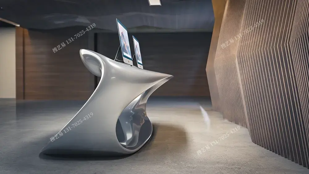 这款接待台以 "流体与温度" 为设计灵感,银色高光曲面前台如液态金属凝固,采用航空级铝镁合金一体成型工艺,经 12 道手工抛光呈现镜面质感;搭配暖棕竖纹实木背景墙,冷热材质碰撞营造科技与自然共生的高级氛围。台面尺寸可定制(常规 1.8m×0.8m×0.9m),适配企业前台、艺术展馆、高端商业接待区等场景。
