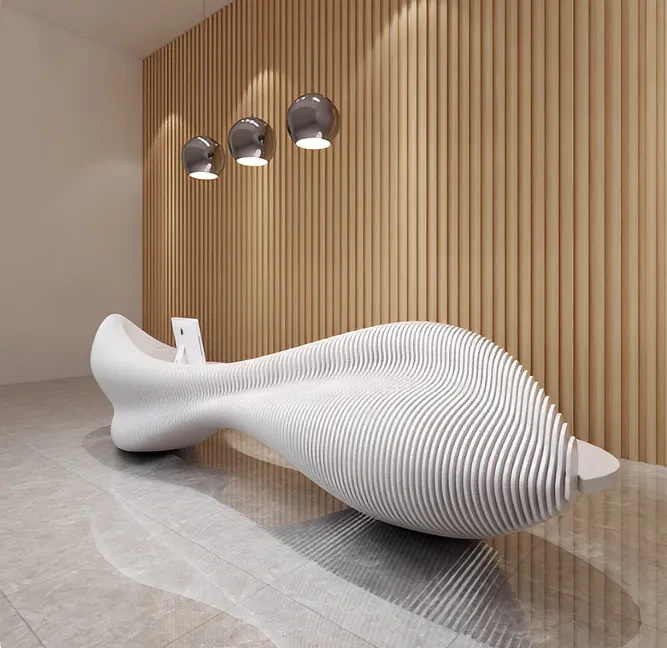对于注重生活品质的别墅业主或追求品牌溢价的商业空间而言,家具早已超越实用范畴,成为承载审美品味与文化内涵的载体。白鲨创意接待前台的出现,正是为了满足这种「让实用物件拥有艺术灵魂」的需求 —— 它不仅解决了普通前台的功能性问题,更通过定制化的艺术设计,让空间入口成为值得细细品味的视觉焦点。