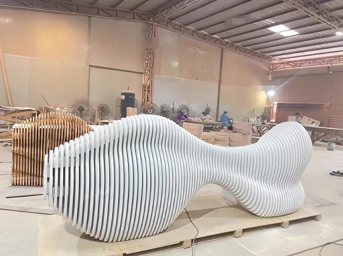 A:我们采用「三审三校」工艺评审机制:初步设计方案会经过材料工程师、工艺技师、美学顾问的联合评审,确保创意与材质特性匹配;生产前进行 1:10 小样打样,客户可现场确认金属拉丝方向、漆面光泽度等细节;量产阶段每道工序均有质检拍照存档,客户通过专属账号即可实时查看生产进度。以白鲨接待前台的金属浮雕 logo 为例,从激光雕刻模板到手工打磨肌理,每个环节都经过 5 次细节校准,最终呈现的立体纹路误差不超过 0.5mm。